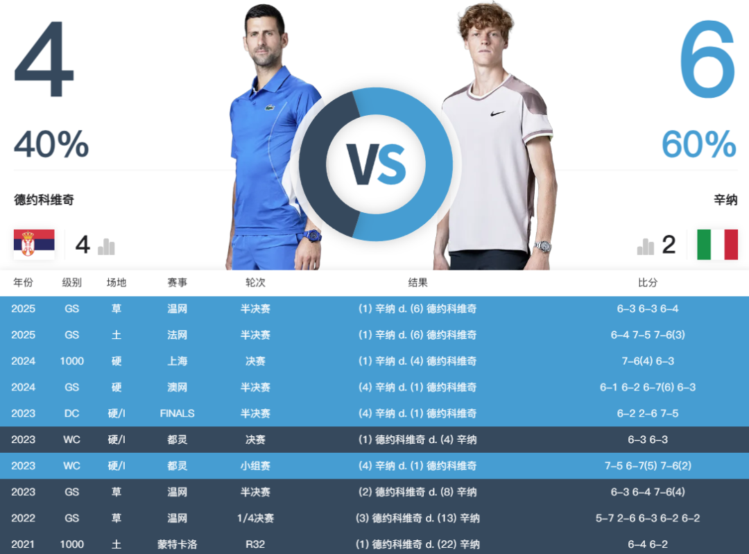 男单下半区,德约将再战辛纳。同样是先来回顾两人过往的交锋史。自2023年年终总决赛与戴维斯杯攻守易形,辛纳已经取得了对德约的一波五连胜。意大利人也将H2H记录从落后反超至6-4的领先。