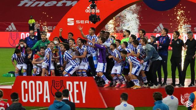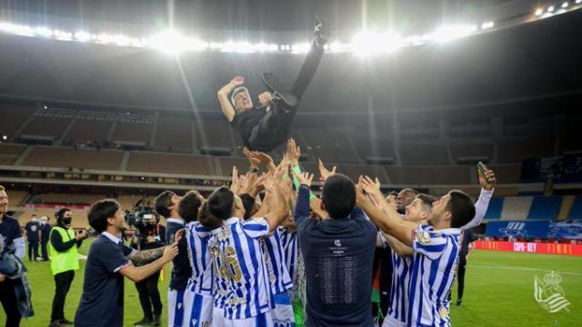 尽管球队领先足足30分钟,直到比赛结束哨声响起,皇家社会主席阿佩里拜都极度紧张,只敢从手指缝中观看比赛。然而夺冠时刻真的到来时,所有皇家社会人情绪决堤。素来沉稳的主教练伊马诺尔·阿尔瓜希尔在新闻发布会现场脱下西服,换上球衣,高举围巾嘶吼道:“皇家社会加油!皇家社会雄起!这冠军属于整个吉普斯夸!”