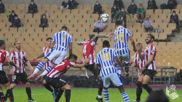 毕尔巴鄂方面阵容相对齐整,而皇家社会面临多个位置主力缺阵。然而真开打后,有“雄狮”称号的毕尔巴鄂发现对方的决心体现在了行动中。向来崇尚技术流、较少身体对抗的皇家社会整场凭借发狂的拼抢和战术犯规牢牢掌控住了中场,在中前场断下皮球就立刻打出快攻。毕尔巴鄂的战术执行相当僵硬,在对方全场围抢的压力下依然寻求地面倒脚配合,一次次将球传进对方包围圈内,传接成功率惨不忍睹。这样不但防线疲于奔命,体能消耗巨大,前场水平最高且配合熟稔的攻击群穆尼亚因、威廉姆斯和劳尔·加西亚基本拿不到球,自然也创造不出进攻机会。